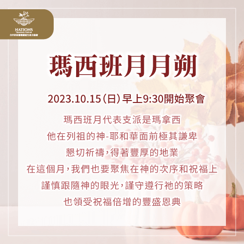 親愛的列國家人們平安,10/15(日)我們迎來瑪西班月(Cheshvan),猶太人也稱之為布勒月(Bul),代表支派是瑪拿西(Manasseh),瑪拿西是十二支派中占地最大的一支,也是唯一佔有兩片領土的支派,《約書亞記》13章8節說到:「瑪拿西那半支派和流便、迦得二支派已經受了產業,就是耶和華的僕人摩西在約但河東所賜給他們的。」在屬於瑪拿西的月份,我們要聚焦在神的次序和祝福上,謹慎地跟隨神的眼光,謹守遵行祂的策略,得地為業。求神賜下恩膏,讓我們的全人全心能夠被轉化,重新塑造,與神美好的計畫連結!讓我們一同參與瑪西班月月朔聚會,一起來探索這個特別月份的深層含義!並領受那豐足昌盛、祝福倍增的豐盛恩典!